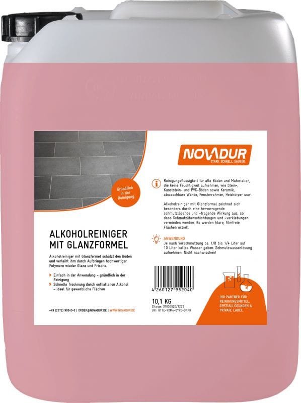 Mit Alkohol für streifenfreie Sauberkeit und neuen Glanz. Entfernt sämtliche Verschmutzungen von wasserbeständigen Oberflächen. Mit guter fettlösender Wirkung. Der Allesreiniger kann auch bei fettigen Verschmutzungen für die tägliche Fußbodenreinigung benutzt werden.