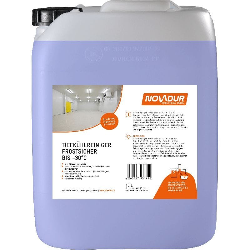 Konzentrierter Reiniger für Kühlhäuser, Kühlzellen und Kühlschränke. Frostsicher bis -25°C. Bei niedrigeren Temperaturen erschwert Eiskristallbildung die Reinigung . Entfernt Fette und Eiweißablagerungen von Böden und Wänden.