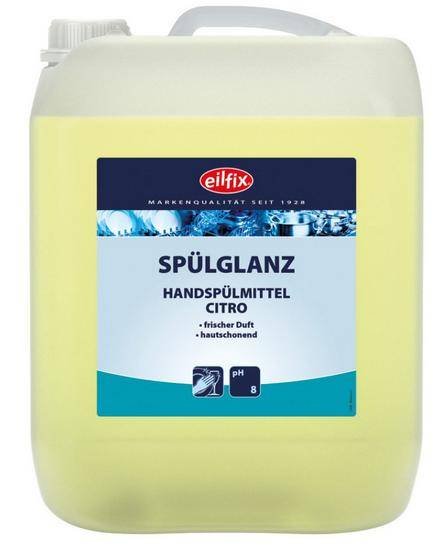Eilfix Spülglanz Handspülmittel mit frischen Citrusduft ist ein ergiebiges Spülmittel mit starker Wirkkraft. Es besticht durch seine hautschonende Formulierung und ist somit für die tägliche Nutzung geeignet.
