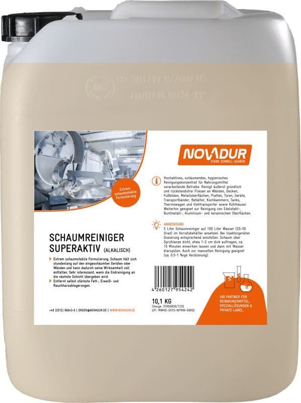 Extra starker alkalischer Schaumreiniger. Hochaktives, schäumendes, hygienisches Reinigungskonzentrat für Nahrungsmittel verarbeitende Betriebe. Reinigt äußert gründlich und rückstandsfrei Fliesen an Wänden, Decken, Fußböden, Metalloberflächen, Platten, Türen, Geräte, Transportbänder, Behälter, Kochkammern, Tanks, Thermowagen und Viehtransporter sowie Kühlhäuser. Weiterhin geeignet zur Reinigung von Edelstahl-, Buntmetall-, Aluminium- und keramischen Oberflächen.