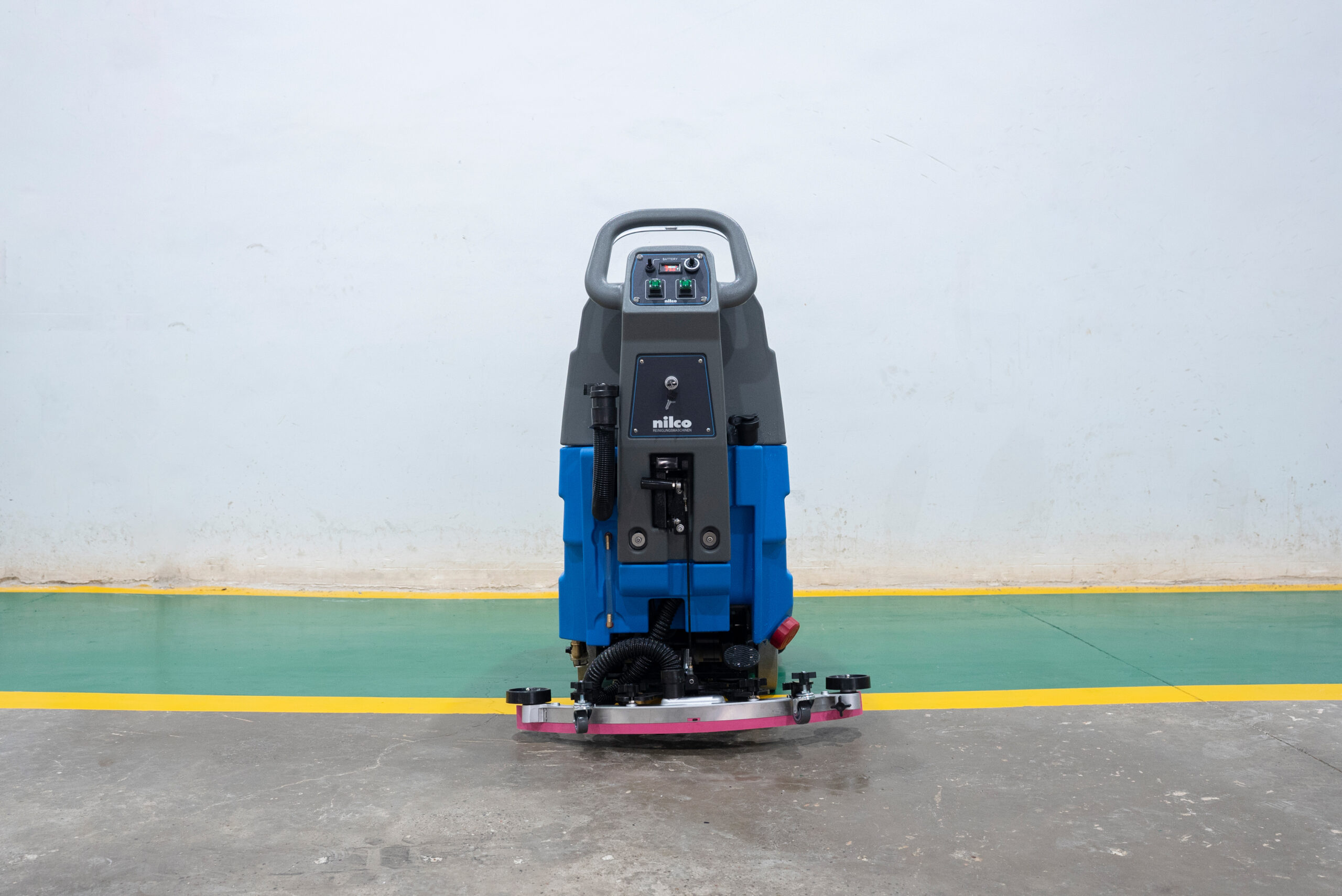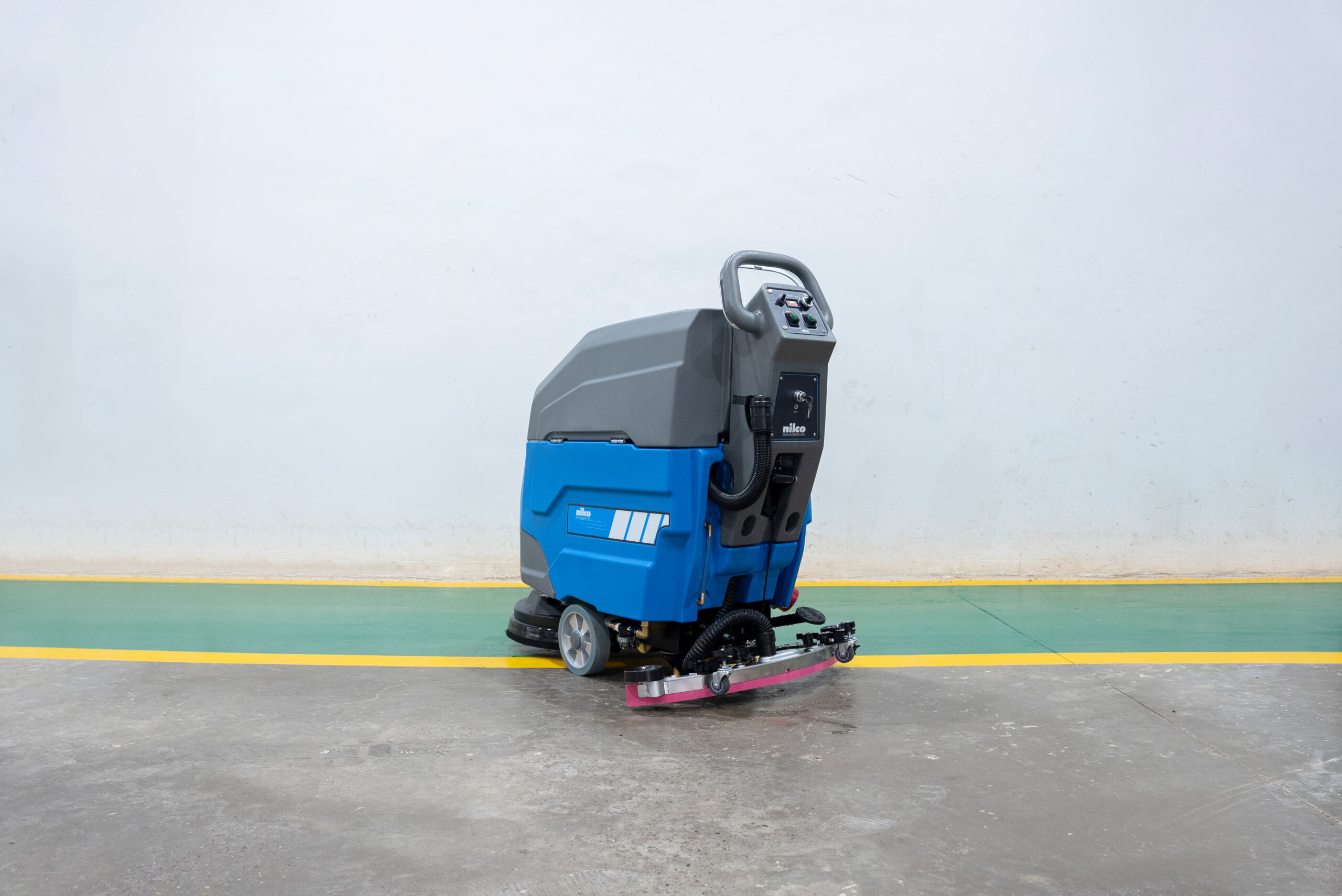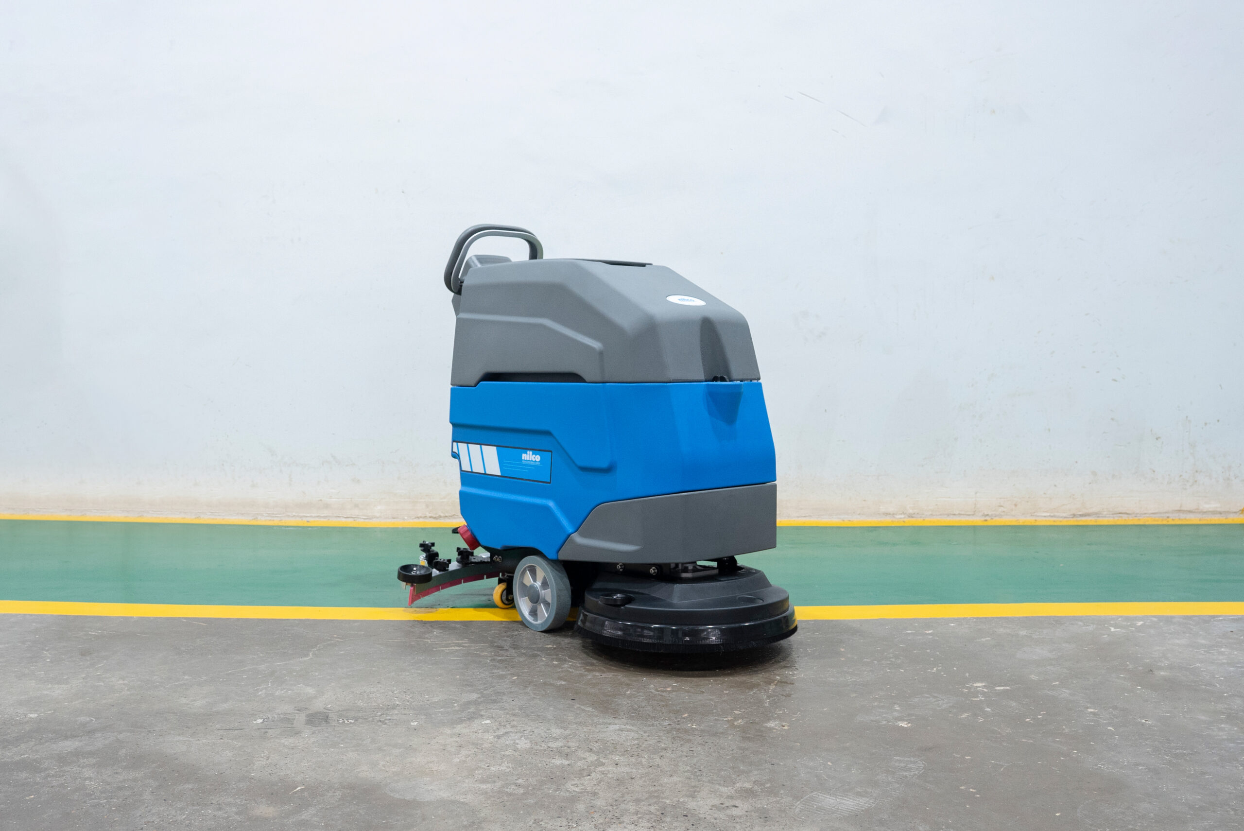 Leistungsstarke Scheuersaugmaschine mit Fahrmotor für mühelose Reinigung. Stoßdämpfende Räder und flexible Sauglippen aus Naturgummi schützen Böden und Maschine. Wartungsfreie Batterie, große Frischwassertanks und intuitive Bedienung über einfaches Bedienfeld. Ideal für Hotels, Bibliotheken, Einkaufsmeilen, Wartebereiche und Logistiklager.