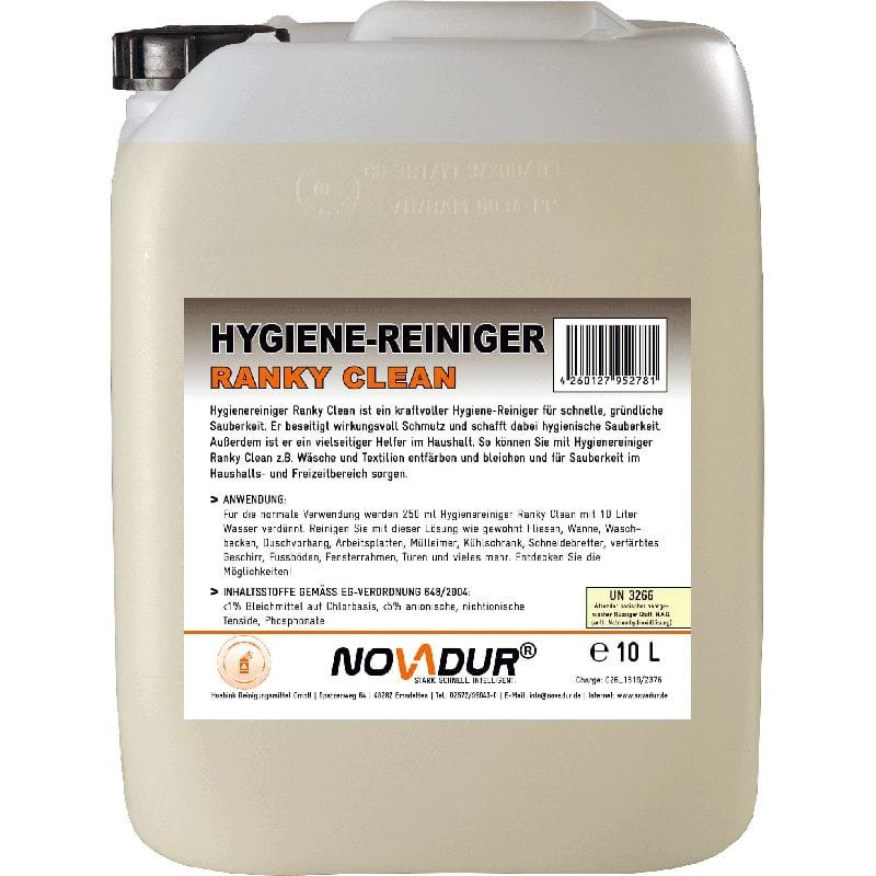 Unser kraftvoller, chlorhaltiger Hygienereiniger für schnelle und gründliche Sauberkeit. Er beseitigt wirkungsvoll Schmutz und schafft dabei hygienische Sauberkeit. Außerdem ist er ein vielseitiger Helfer im Haushalt. So können Sie mit Ranky Clean z.B. Wäsche und Textilien entfärben und bleichen und für Sauberkeit im Haushalts- und Freizeitbereich sorgen.