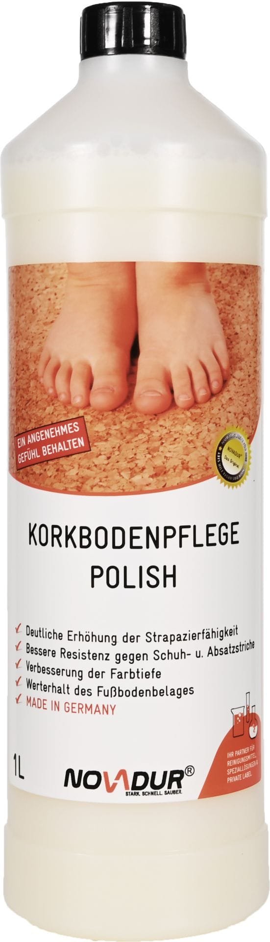 Polymerdispersion, die den neuen Korkboden gegen Gehspuren und Kratzer schützt. Korkbodenpflege Polish verleiht dem Korkboden einen angenehmen seidenmatten Glanz.