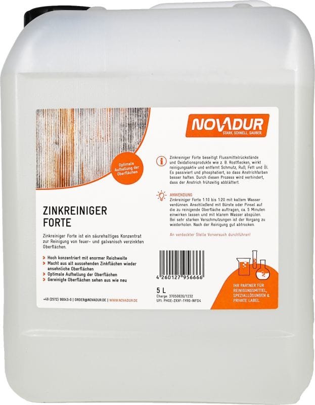 Unser Spezialreiniger für verzinkte Oberflächen, Zinkreiniger Forte, ist ein säurehaltiges Konzentrat zur Reinigung von feuer- und galvanisch verzinkten Oberflächen. Er beseitigt Flussmittelrückstände und Oxidationsprodukte wie z.B. Rostflecken, wirkt reinigungsaktiv und entfernt Schmutz, Ruß, Fett und Öl.